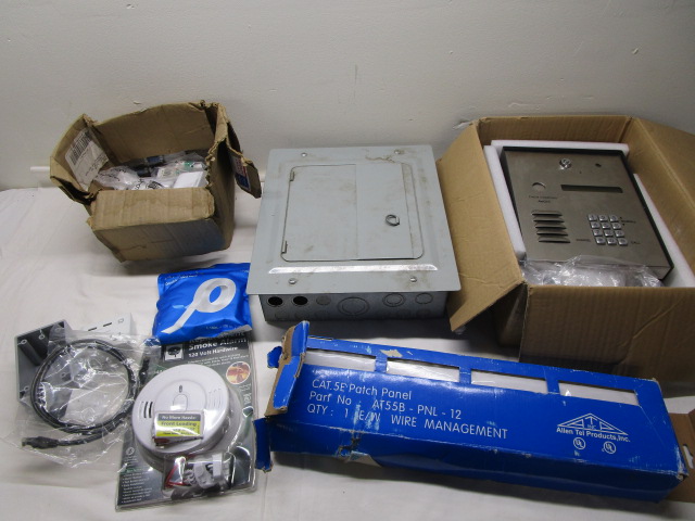 This selection of home security/improvement items includes a new Kidde brand replacement smoke alarm, a Pach & Company AeGis telephone entry system (model # 7150P), a metal electrical breaker box, and an assortment of new phone jacks. These items are in new and used condition. Please preview.
