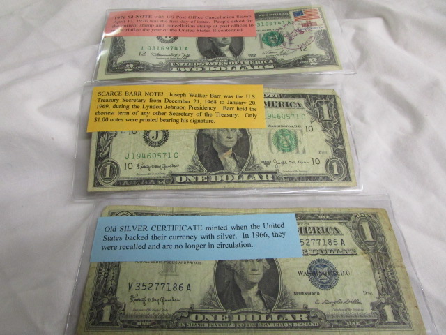 This trio of US bills includes a 1976 $2 note with a US Post Office Cancellation Stamp (April 13, 1976 was the first day of issue), a Scarce Barr Note (Joesph Barr was the US Treasury secretary from 12/21/1968-1/20/1969 and only $1.00 notes bear his signature) and an Old Silver Certificate minted when the United States backed their currency with silver. These items are in circulated condition. Please preview.