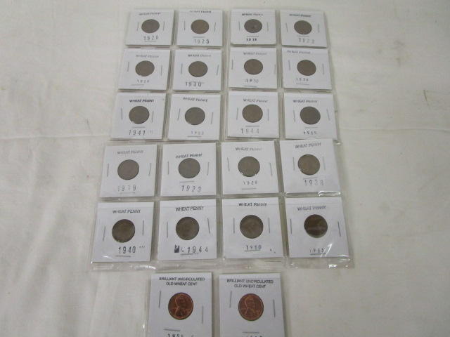 This collection of twenty two wheat cents includes two brilliant uncirculated old wheat sense (1955 S, and 1958 D). Also included are twenty circulated wheat cents with years ranging from 1919 to 1955. Please refer to photographs for specific dates. These coins are in uncirculated and circulated condition. Please preview.