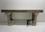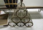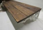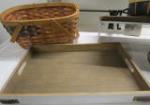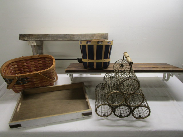 This assortment of six country style home decor pieces includes two baskets, a wire wine tote, a wooden serving tray, a wooden wall shelf with white metal brackets and a small wooden bench. These pieces are in used, good condition. Please preview.