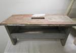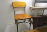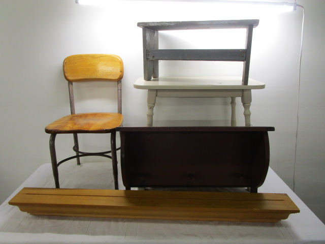 This assortment of home decor includes an old school chair, a 48" plate display rack, a 27" primitive shelf with coat pegs, a small 46"W X 14"D X 23" white wooden bench and an additional primitive bench/step stool. These items are in used, good condition. Please preview.