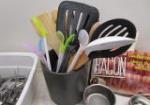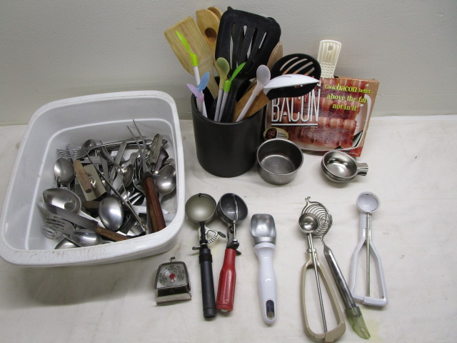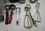 This assortment of kitchen utensils and tools includes spatulas, ice cream scoops, melon ball scoops and more. These items are in used, good condition. Please preview.