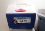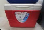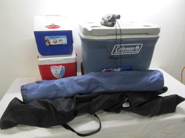This selection of camping/tailgating equipment includes two nylon folding chairs (one with the Verizon name), a large 120 quart Coleman brand cooler, two 7 quart coolers (one PLaymate, one Coleman) and a pair of "The Sharper Image" binoculars. These items are in used, good condition. Please preview.