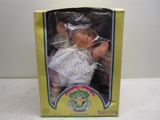 This darling collectible unopened 1985 Cabbage Patch Kids preemie (Henrika Bryna), with her official birth certificate, is in new, unopened condition. The box has some wear due to storage.