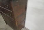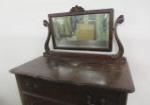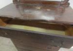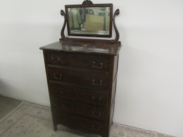 This gorgeous antique tiger oak wooden chest of drawers features five drawers (with dove tail design), and a beautiful beveled mirror. This item measures 32"W X 17"D X 47"H. The total height with the mirror is 66". This piece does show wear due to age and is missing two handles. It is in previously owned condition. Please preview.