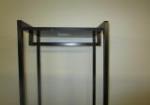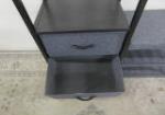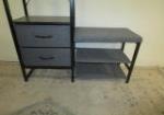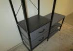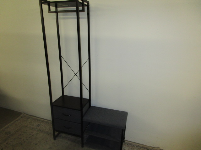 This tall industrial style free standing hall tree with a hanging rod, features two drawers and a cloth bench with additional storage. This item measures 37" W X 12"D X 68-1/2"H. This item is in previously owned, good condition. Please preview.