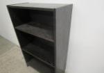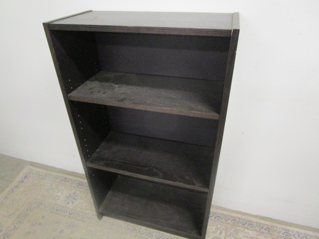 This dark three (adjustable) shelf, composite bookcase measures 23-1/2"W X 11"D X 42"H. This item is in previously owned, good condition. It does have some scratches on the top. Please preview.