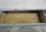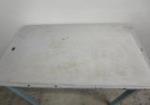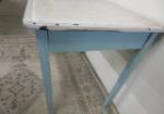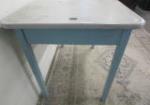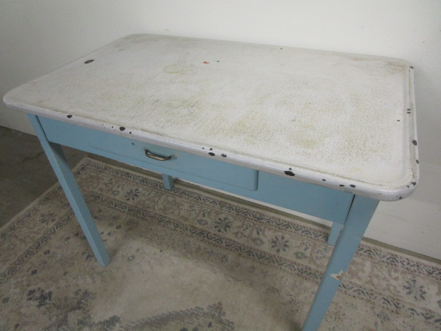 This vintage enamel-top kitchen table features a white surface, light teal wooden base and one drawer. This item measures 40"W X 25"D X 31"H. It does have some wear due to use as shown in the photos. This item is in previously owned condition. Please preview.