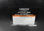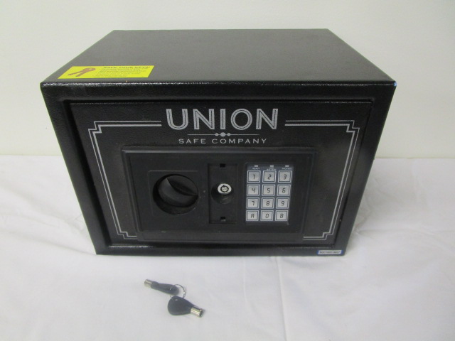 This Union Safe Co. electronic safe (model # 62679) measures 13-3/4"W X 9-3/4"D X 9-3/4"H. This safe is not fire resistant. This item is in previously owned condition. Please preview. Safe has a key but no combination.