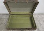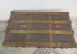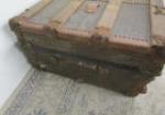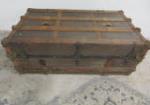 This antique steamer trunk features a flat top and ornate hardware. This piece measures 32-1/2"W X 19"D X 13"H. These items are in previously owned, antique condition. Please preview.