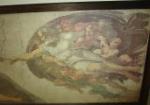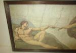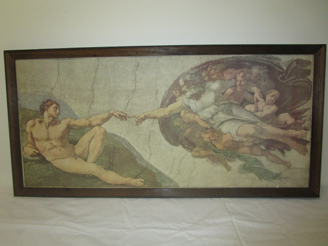 This nice 34-1/2" X 17" framed print (on board) of Michelangelo's famous fresco titled "The Creation of Adam" This item is in previously owned condition. Please preview.