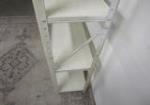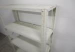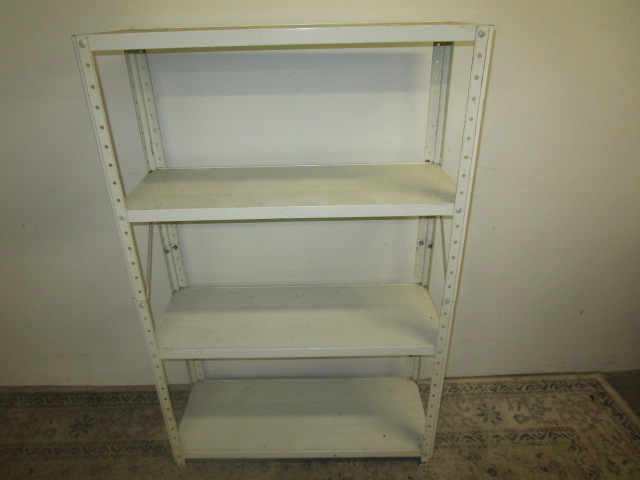 This white metal storage unit features four adjustable shelves. This unit measures 30"W X 11-1/2"D X 46"H. This unit is in previously owned condition. Please preview.