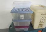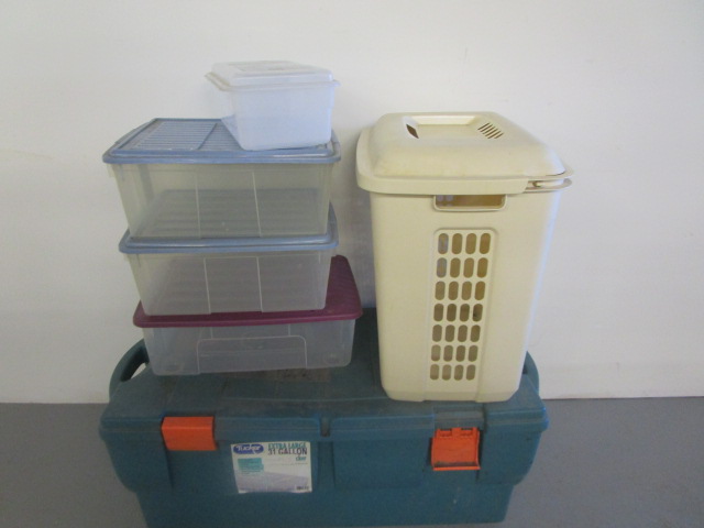 This assortment of seven storage items includes a hamper, a Tucker X-Large 31 gallon storage bin with a hinged top, two 17 quart bins with lids and more. These items are in previously owned, good condition. Please preview.