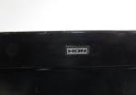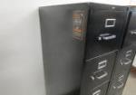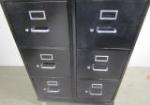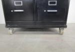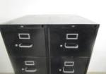 This pair of side by side, four drawer black metal file cabinets on a base with casters measure 30"W (15" each) X 26"D X 56-1/2"H. There are areas of miner chips in the paint on the drawers. Overall these items are in good condition. Please preview.