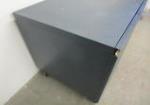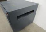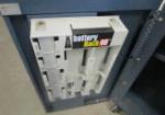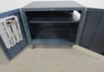 This metal 2-door storage/utility cart with a battery pack storage shelf measures 26"W X 23"D X 24-1/2"H. There are some small areas of surface rust on the top of this unit. It is in previously owned condition. Please preview.