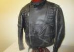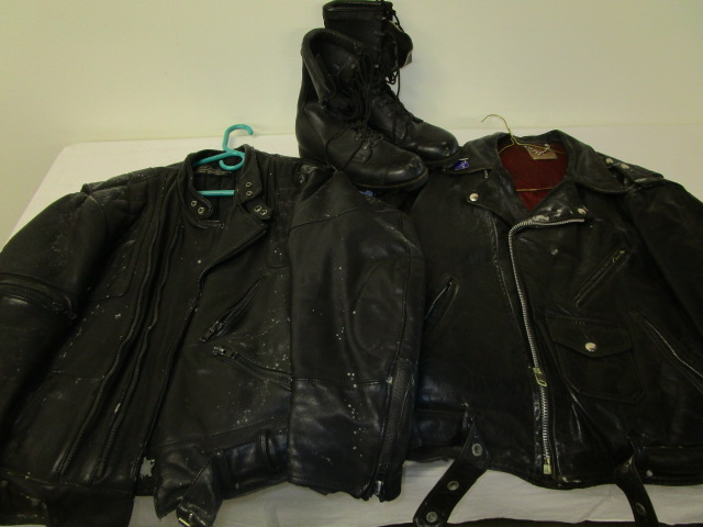 This pair of black leather motorcycle jackets includes a men's (size 52) Heim Gericke Harley-Davidson jacket and a size L Fidelity Sportsman jacket. Also included is a pair of black size 8-1/2 W. black leather boots. This item is in previously owned condition. Please preview.