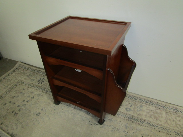 This nice "Dreams Flying Co". composite, four-shelf side table with a magazine storage holder measures 15-3/4"W X 22"D X 24"H. This table has some small scratches on the side, otherwise it is in previously owned, good condition. Please preview.