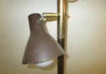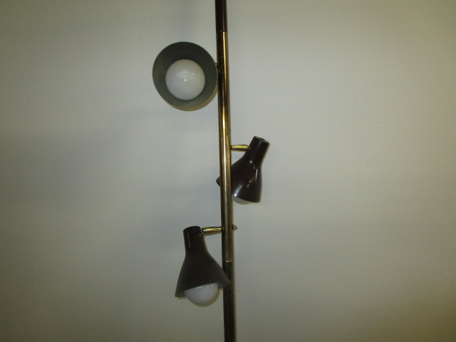 This Mid-century modern brass and wood tension pole lamp with three adjustable lights with metal shades. When extended this pole extends to 88"H. This item is in previously owned condition. This item has not been tested and is being sold as is. Please preview.