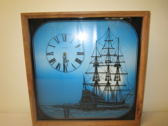 This vintage Verichron nautical shadow box (quartz) wall clock features a sailing ship silhouette. This clock measures 19"W X 3-1/2"D X 19"H. This item is in previously owned, good condition. Please preview.