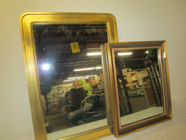 This pair of heavy wall mirrors with gold-toned frames measure 19" X 23" and 30-1/2" X 22-1/2" (although they could be hung either way). These mirrors are in good condition, however the paper trim on the frame is coming off in two areas. Please preview.