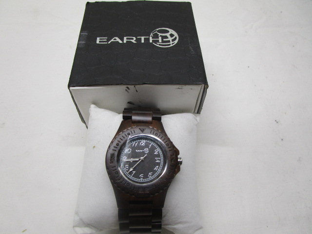 This beautiful new Earth Wood unisex dark wood watch with a date display features a quality quartz movement and non-glare scratch resistant mineral crystal. This watch is in new condition. Please preview.