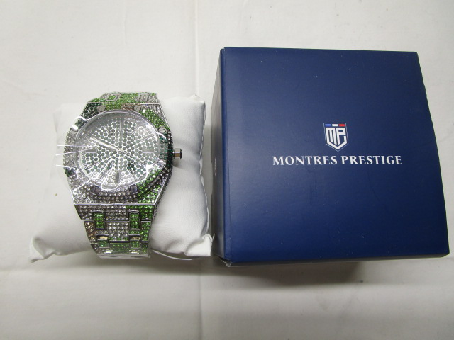 This new Montres Prestige X Invicta men's watch features a gold-tone and green crystal-encrusted design. This watch is in new condition and comes in its original box. Please preview.