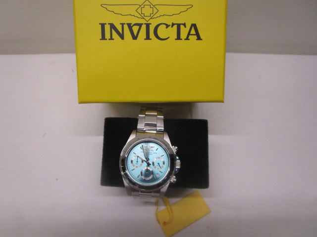 This gorgeous new Invicta Speedway 17311 chronograph men's watch features a silver-toned case and bracelet and a light blue dial. This item is in new condition. Please preview.