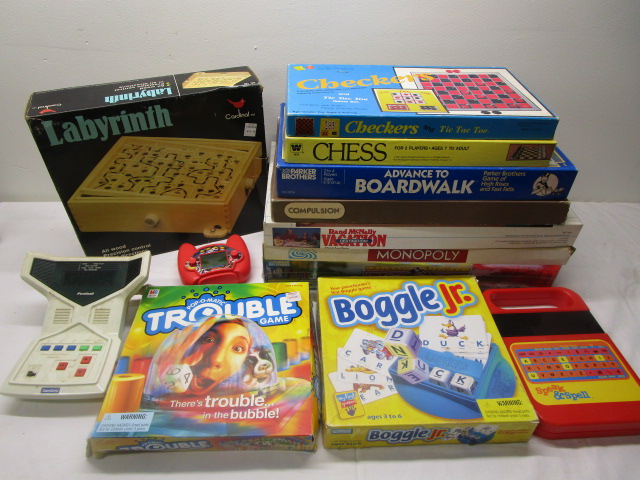 This large assortment of eleven family board games includes "Chess," "Advanced To Boardwalk", "Compulsion", "Monopoly" and more. These items are in previously owned, good condition. Please preview.