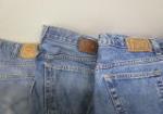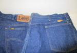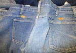 This collection of nine pairs of men's jeans including Cannon River Blues, Wrangler, Lee, and Rustler brands. Sizes include seven 40 short, one pair of 34 short and one pair of 32 short. These items are in previously owned, good condition. Please preview.