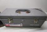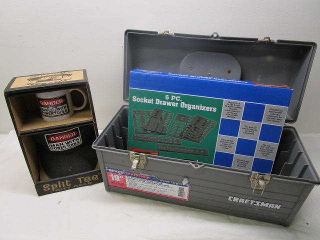 This trio of tool related items include a Craftsman brand 19" toolbox, a Storehouse 6pc. socket drawer organizer set and a Split Tee gift gear set including a coffee cup and baseball style hat with the logo "Danger- Man With Tools". These items are in previously owned, good condition. Please preview.