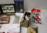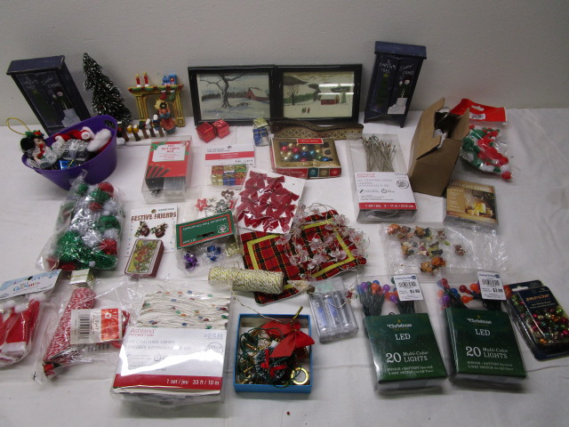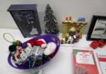 collection of assorted Christmas decorations and holiday items, including dollhouse miniature sets and vintage Noma Christmas light sets. Items: Includes various boxed ornaments, lights, and miniature accessories. Condition: Items are shown in their original packaging. Please preview.