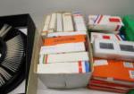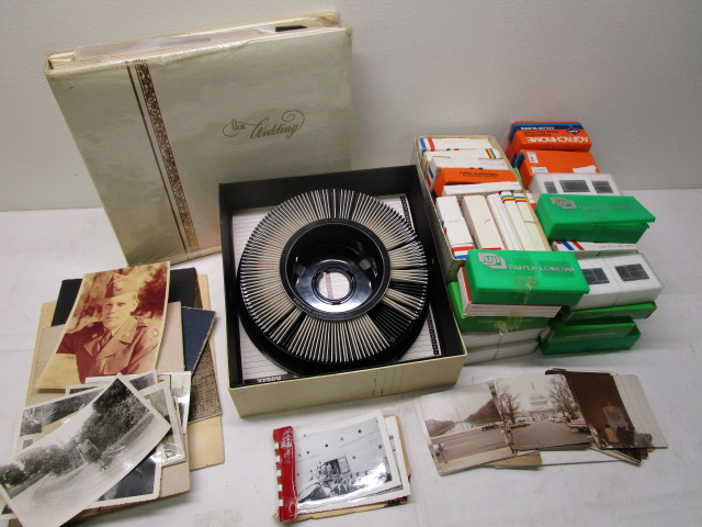 Bin of vintage photograph, boxes of slides with lots of travel pictures and one Kodak slide carousel. Please preview.