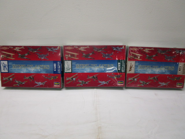 Three Hasegawa Mini-Planes Hobby kits. Includes an MP11 Sopwith Camel #86611, an MP5 Morane saulnier N #86605, and an MP2 Focke-wulf FW 190A #86602. These are sealed in the box kits. Please preview.