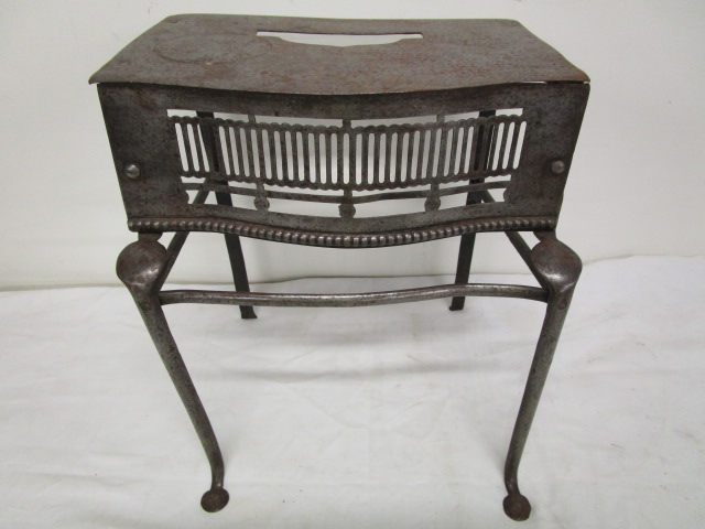 Interesting 12"W X 10"W X 14" antique footman's stool also known as a fireplace trivet. This item was used to warm kettles, dishes and irons warm by placing it in front of the fireplace. This item is in previously owned, antique condition. Please preview.