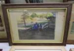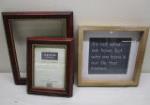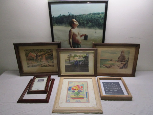 This collection of six pieces of wall art and two frames. range in size from 5" X 7" to 21" X 29". These wall art items include an inspirational quote, a framed print titled "Homage to Matisse", a pair of Adolph Treidler Bermuda prints. and two family vacation photos. These items are in previously owned condition. Please preview.