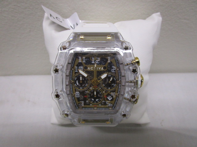 This Activa X Invicta Men's watch with Skeleton Dial (model # ACW2305-023) features a skeletonized dial, transparent design and silicone strap. This watch is in new condition in its original package. Please preview.