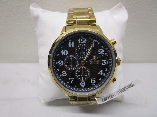 This classic Montres Prestige (model # MPW-0319) Men's watch is a collaboration piece through Invicta watches. This watch features a Precise Quartz movement, a 43.5 mm gold tone case with a black dial. This watch is in new condition in its original package. Please preview.