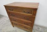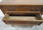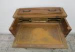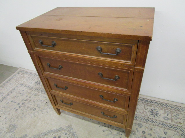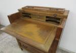 This unique vintage butler's secretary desk characterized by three lower dresser-style drawers and a hinged top drawer that folds down to reveal a (pull out) writing surface a center drawer and various letter slots. also features tongue and groove drawers. This item measures 27"W X 16"D X 34-1/2"H. The hinges will need repair as they are loose. Overall this piece is in previously owned, good condition. Please preview.