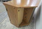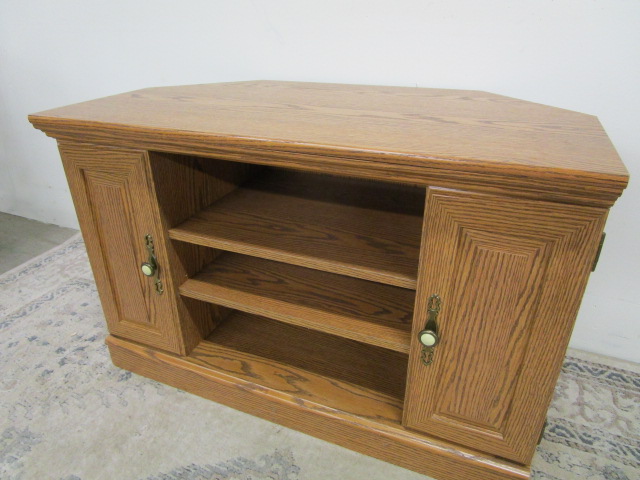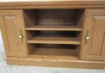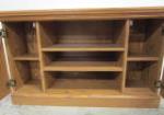 This very nice oak style veneer media console features three visible shelves, two doors and additional adjustable shelves behind the doors. This item measures 36"W X 20"D X 23"H. This item is in previously owned, good condition. Please preview.