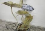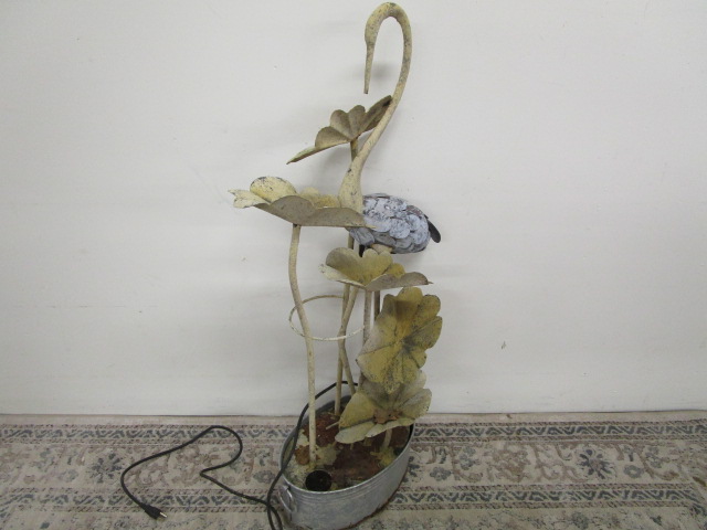 This unique 43" metal garden fountain features a heron and flowers with a galvanized bucket base. This item is weathered and there is rust on the bottom of the bucket. This item has been tested and does power up. It is undetermined if the water feature works or if it will hold the water. It is being sold as is. Please preview.