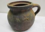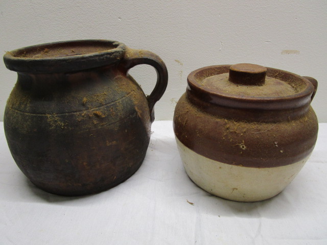 This interesting pair of vintage, rustic bean pots includes a 6" pot possibly from Romania and a 5" stoneware bean pot with a lid. These items are in previously owned, good condition. Please preview.