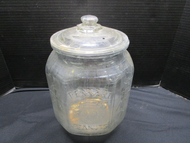 This impressive 13" octagonal, covered vintage Planters Peanut store counter jar features embossed graphics including "Planters Peanuts 5 Cents", and the iconic Mr. Peanut figure. The lid is not the original. This item is in previously owned, good condition. Please preview.