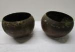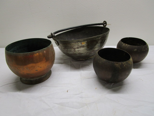 This collection of four metal bowls includes two 4" decorative copper bowls, a 5" copper planter and a 5" handled metal bowl. These items are in previously owned condition. They do show some wear due to age and oxidation. Please preview.