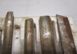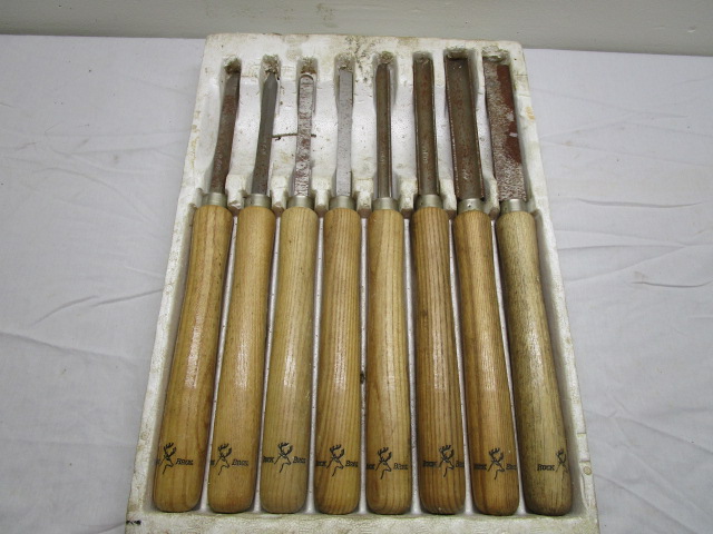 This set of Bucks Brothers (Buck Bros.) wood lathe turning chisels include gouges, scrapers, skews, and parting tools. These tool do have some rust in areas but are in overall previously owned, good condition. Please preview.