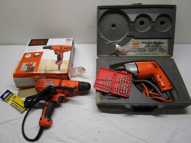 This pair of Black and Decker drills includes a U-207K, 1/4" Delux variable speed drill kit and a 5.5 Amp Drill/Driver. The drill kit is missing several pieces however the drill and drill bits are included. These items are in previously owned condition. These items have been tested and power up. They are being sold as is. Please preview.