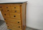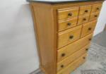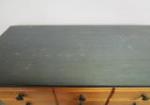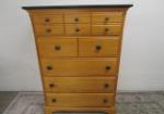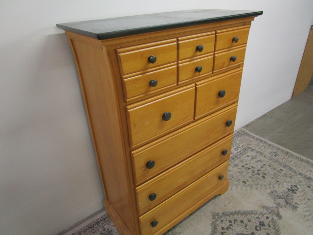 Five drawer chest by Little Folks, new london, wisconsin. Natural finish with stained Green Top and matching knobs. Constructed of maple solids and veneers. Drawers are on rollers and the chest is in overall good to very good solid condition with some scuffing to the top. Measures approximately 51 in tall by 36 and 1/4 in wide by 18 in deep. The natural wood is in beautiful condition, please preview.