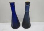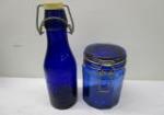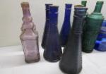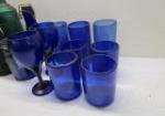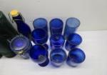 Glass bottle collection with thick cobalt blue drinking glasses, bottle, jar and wine glasses. The taller bottles are decorative and stand approximately 12 in tall and are a variety of colors. No Stoppers or caps. All in good condition with no chips or cracks. Please preview.