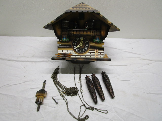 This stunning Vintage German Black Forest Musical Cuckoo Clock (Model # 688-7516) features a chalet style front. This beautiful clock plays "Bayrischer Landler" (a Folk Dance) and "Kuckuckswalzer" (Cuckoo Waltz). This item is in previously owned, good condition. Please preview.