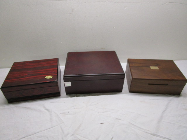 Three Wooden humidor boxes. Three Wooden cases in overall good to very good condition. To have their humidity dials, one is missing. 10 1/2 in to 12 in sizes. Please preview. Used to store cigars.