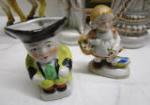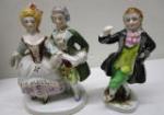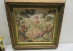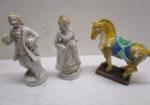 Porcelain 18th century Court figurines most likely made in mid-century of the 20th century with tapestry framed art and Chinese glazed horse with two poodle figurines and Japanese mini pitcher. The figurines range and sizes from 2 in to 6 in and the framed tapestry measures 10x10. Very good to excellent condition for the collection some crazing in the glazing on the horse but no chips or cracks. Please preview.